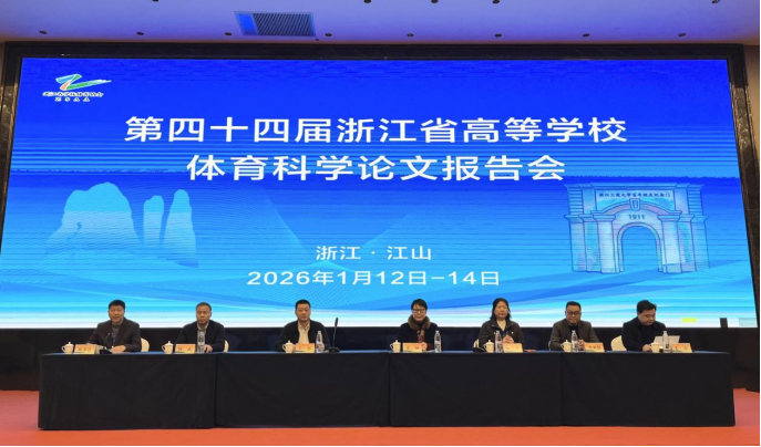 2026年1月12-14日,由浙江省学校体育协会、浙江省高等教育学会体育教育分会主办,浙江工商大学承办,江山市教育局协办的第四十四届浙江省高等学校体育科学论文报告会在江山市举行。来自全省53所高校的240余名教师和学生参加了本届科报会。江山市副市长王展,浙江省学校体育协会常务副秘书长姜丽、陈平,浙江省学校体育协会教科研负责人、浙江水利水电学院体育部主任李亚慰,杭州师范大学体育学院院长周武,浙江工商大学体育工作部主任郑苏法,江山市教育局局长毛彦等出席开幕式。